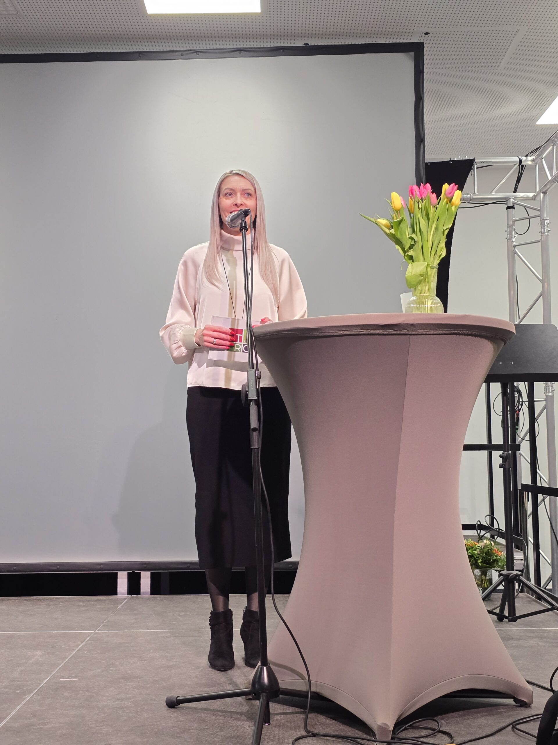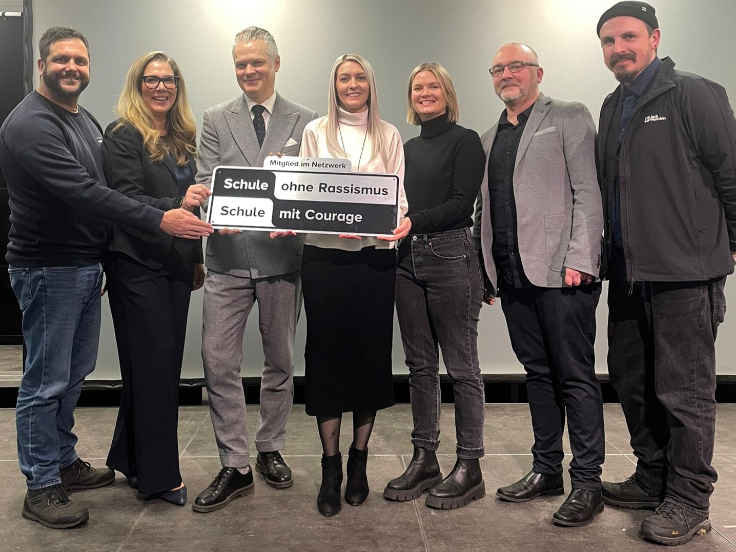 Dann war der große Moment gekommen: Marlene Jakob, die Landeskoordinatorin vom Netzwerk für Demokratie und Courage e. V., übergab Miriam Mebarki und Tristan Schwanenberg feierlich das SoR-Schild, das nun unseren Eingangsbereich schmücken wird. Endlich!!!